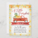 chá de fraldas de abóbora, de cor aquosa e rústica, com um caminhão vermelho, várias abóboras, folhas de outono e faixa de cor aquosa. Este convite é uma forma doce de convidar convidados para um chá de fraldas neutro em relação ao gênero ou para o outono do rapaz.