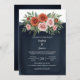 O histórico elegante do convite de casamento com textura de cor d'água profunda do marinho e um buquê de terracota e rosas esmagadores com folhagem verde esmagadora. Perfeito para impressão a pedido de papelaria de casamento.