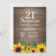 Convite rústico do aniversário de 21 anos da surpresa do girassol. Flores florais e fundo de madeira rústico. Vintage do país retro. Aniversário das mulheres. 12o 13o 15o 16o 18o 20o 2ø 30o 40th 50th 60th 90 100th do 80 do 70, algumas idades. Digitas Printable. Para uma personalização mais adicional, clique por favor "personalizam-no" botão e usam-nos nossa ferramenta de design para alterar este modelo.