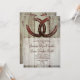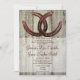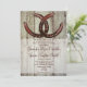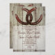 Este convite ocidental do casamento do país rústico tem duas ferraduras entrelaçadas na parte superior do convite. O fundo é impressão de madeira afligido do celeiro. A parte traseira do convite tem o mesmo design rústico do estilo country com a palavra "amor" no roteiro. Você poderia mudar este fraseio para personalizá-lo com os nomes dos noivos se você quis a. Estes convites do casamento do tema do país são perfeitos para casamentos do vaqueiro.