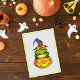 Um convite para festas de Halloween com um sapo de desenho animado verde e inseto vestindo um chapéu de bruxa roxa e sentado numa abóbora de Halloween!
