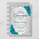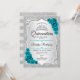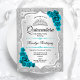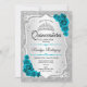 Convite de festas de Quinceanera. Na moda design em prata brilhante e lacrimejo. Apresenta faixas, fontes de script, rosas, tiara e confetti. Perfeito para uma comemoração de 15 de aniversário do estilo clássico da princesa do glam. Impressos convites Zazzle ou modelo de impressão digital instantânea para download.