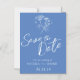 Simples casamento de desenho botânico, salvar o convite de data em azul e branco. Edite esta opção para salvar o cartão de casamento de data com seus próprios nomes e data. Desenho único de design e flor de mão original de Sarah Trett somente para www.mylittleedenweddings.com Você dá suporte ao artista original diretamente quando compra este produto.