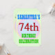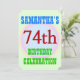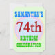 Este design de convite de aniversário divertido apresenta uma mensagem como "A 74ª CELEBRAÇÃO DE ANIVERSÁRIO DE SAMANTHA", onde o nome e o número de aniversário podem ser personalizados. Ele também apresenta um fundo multicolorido e divertido. Os detalhes do evento no verso podem ser personalizados. Poderia ser usado para convidar pessoas para a comemoração ou festa de aniversário do 74º aniversário de alguém. [~Z0000311]
