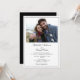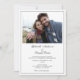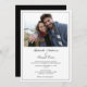Este simples convite para o casamento traz uma foto horizontal na frente e um texto simples para o convite. A parte de trás é preta com uma caixa branca contendo direções de RSVP.