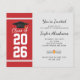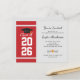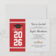 Adicione seu ano de formatura, nome e detalhes do local com data a este convite de festa de formatura com fundo moderno em vermelho e branco e tipografia preta usando nosso botão "Personalizar" acima.