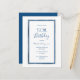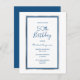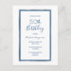 Na frente: Um fundo branco chic com uma falso prata e um quadro azul clássico. Simples e elegante! Modelos para um nome e detalhes da festa. O nome e o texto: 50º (ou qualquer idade) Aniversário são escritos com um guião estilo manuscrito, letras azuis. Perfeito para um inverno, primavera ou festa de aniversário náutica de verão! Traseira: fundo azul clássico colorido. Dica: Se você não quiser que pareça um cartão postal, clique em personalizar, vá para o verso e remova o divisor e o carimbo de posto.