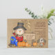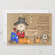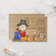 Um convite adorável, do tema do outono, com um espantalho sorridente sentado ao lado de um cartaz com a sua redação. Há abóboras espalhadas e um cachorrinho fofo. Um convite perfeito para qualquer celebração do outono.