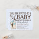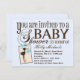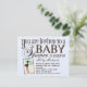 Um convite sofisticado para chás de fraldas com um fundo azul muito claro e um texto marrom. design de armazenamento com arco azul e pacote no canto inferior esquerdo. Personalize o texto com detalhes da sua ocasião.