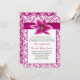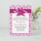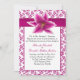 Um convite para o casamento floral, com um rosa violeta na cor damasco floral branca, gráficos de uma fita de cetim rosa violeta e um adorável florescimento lírio. Uma área de texto em branco, de estrutura rosa, tem texto preto e rosa pronto para personalizar para o dia especial. Os produtos correspondentes estão disponíveis.