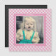 Este é um ímã comemorativo com sua foto e texto. Há modelos de texto para facilitar a alteração do nome e da data. Há também um modelo de foto para facilitar a adição da imagem. O design cor-de-rosa e branco é um padrão clássico de verificação de gingham. O exemplo é um instantâneo antigo digitalizado a 300 pixels por polegada. Divirta-se com isso. Isto faz uma bela manutenção ou um presente memorial para a família e amigos para os seus frigoríficos, cubículos ou armários.