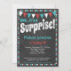 Um chalkboard aqua engraçado e um convite de aniversário surpresa vermelho apresentando o texto desajeitado "Surpresa!" no topo com fundo chalkboard, bandeiras e uma bela borda poka-ponto.