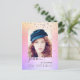 Um convite para uma festa de aniversário surpresa de 21ruas (ou qualquer idade). Personalize e adicione sua própria foto. Na frente: Sobreposição de texto da cinza escura: Shhh! É uma surpresa. O texto é escrito com um moderno estilo escrito à mão. Texto: aniversário de 21 anos. Decorado com um esprinkle de diamante rosa dourado falso. Um fundo de arco-íris tenso e colorido em ouro roxo, rosa e rosa. Fundo: fundo colorido arco-íris, alguns diamantes falsos e letras coloridas de cinza escura. Personalize e adicione o nome e os detalhes da festa.