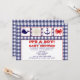 Um convite temático do chá de fraldas do oceano que caracteriza ilustrações no auge de uma baleia, de um dólar de areia, de uma âncora, e de um caranguejo. O fundo na parte dianteira e na parte traseira é guingão azul. Personalize o texto com detalhes de sua ocasião.