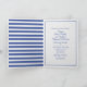 Convite dobrado do casamento do estilo do cartão feito em um tema náutico azul e branco. Um fundo de vista textured branco é acentuado com um quadro azul médio. A parte dianteira do cartão tem gráficos de uma âncora dourada e o esquerdo interno tem um teste padrão listrado azul e branco. Personalize todo o texto para seu casamento.