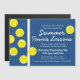 O evento de aula de tênis de verão convida para azul e branco com bolas de tênis amarelas brilhantes. Simples convites divertidos adequados para a aula de verão em eventos de duro e festas tênis. Apresenta arte gráfica simples tênis, em um campo de tênis azul com uma linha branca. Personalize com seus próprios detalhes de evento. Design e gráficos de Sarah Trett. www.sarahtrett.com para www.mylittleeden.com