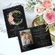Absolutamente espantoso convite de casamento dobrado com detalhes e opções para RSVP todos em um! A frente guarda as informações tradicionais do convite para o casamento com uma linda coroa floral. O dentro à esquerda contém sua foto de noivado favorita e seus nomes enquadrados com um design cardíaco moderno. O lado direito mantém seus detalhes (incluindo traje, recepção e insights de acomodação) e informações sobre como os convidados podem RSVP (on-line através de um site ou por telefone) e o verso retém um design floral adicional e uma mensagem de fechamento: "Não podemos esperar para celebrar com você." O design inteiro pode ser totalmente personalizado.