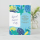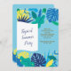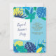 Um convite de festas do verão com folhas tropicais contra uma luz - fundo azul. Aperfeiçoe para toda a celebração do verão. <br/><br/>O cartão é fácil de personalizar com seus fraseio, opções da pia batismal, do cor da pia batismal, as de papel da forma e escolha de seis tipos de papel<br/><br/>Não exatamente que você está procurando? Todos nossos produtos podem ser projetados para encontrar suas necessidades em nenhuma sobretaxa<br/><br/>Contacte-nos simplesmente em askcottonlamb@gmail.com. <br/><br/>Produtos de coordenação disponíveis: Apenas pergunte-nos!"