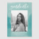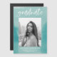 Cartão magnético de anúncio de graduação em aquarela moderna, com a fotografia do formando com um fundo de cor aquosa turquesa. O "Formando" é exibido no topo do convite em um script de aquarela branco, com o nome do formando, o nome da escola e o ano da classe no final.