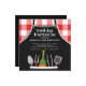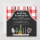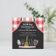 Convite de aniversário de churrasco exclusivo com avental preto com um utensílios de cerveja e churrasco.