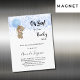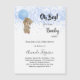 Para um chá de fraldas celebrando um menino. Um fundo branco. Um ursinho de pelúcia segurando um balão azul. Personalize e adicione o nome da mãe a ser e os detalhes da festa. O nome e o texto: Oh Boy! e Barly são escritos com um estilo escrito à mão.