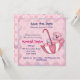 Convite de chá de bebê menina com adorável ursinho rosa andando de guarda-chuva, pontos grandes e outros toques especiais. Personalize com suas informações.