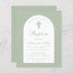 Um convite para o batismo moderno. Em um fundo verde sábio, ele tem um arco branco com dentro de texto sábio. A palavra Batismo e o nome são escritos num guião caligráfico elegante; a primeira linha é o texto arquivado.