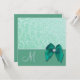 Um teste padrão elegante de brocado do falso do verde da hortelã decora o terço superior deste convite bonito do casamento. Um sólido que combina a parte inferior verde guardara seu monograma no texto pálido. Um arco brilhante do verde da cerceta com um centro da pérola de falso termina a parte dianteira. A parte traseira do convite está combinando o verde com seu texto personalizado. nota do *Please - a imagem é imprimida no convite, que não contem nenhuma tecido, fita, ou pérola real substance.*