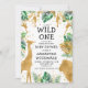 Este convite para chás de fraldas, chamado "selvagem", contém folhas falsas de ouro (girafa, leão e macacos), folhagem dourada e selva verde, e uma aspersão de confete de ouro sobre fundo branco. Adicione o nome da futura mãe e os detalhes do chá em texto preto. Um padrão de folhagem em verde e dourado em fundo branco decora a parte de trás da carta.