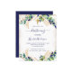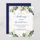 Na frente: Um fundo branco decorado com verde de eucalipto e folhas de ouro e faíscas de brilho dourado. Uma cruz ouro. Personalize e o nome e a cerimônia da criança. Fundo: fundo azul marinho.