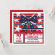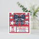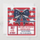 Convite de festa divertido vermelho, branco e azul do dia 4 de julho com um laço azul-marinho fofo com estrelas brancas. O laço está sentado entre listras azuis patrióticas e estrelas brancas contra um fundo vermelho ousado. O verso deste convite de festa personalizável oferece espaço extra para informações para seus convidados no aniversário da América. Aproveite a sua festa!