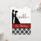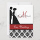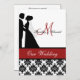 Impressão preto e branco do damasco com uma banda vermelha, uns noivos da silhueta, e áreas que você pode personalizar com seus nomes, inicial do monograma, cerimónia de casamento e informação da recepção em um convite wedding personalizado que seja elegante e tradicional tudo em um!