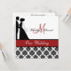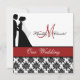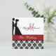Impressão preto e branco do damasco com uma banda vermelha, uns noivos da silhueta, e áreas que você pode personalizar com seus nomes, inicial do monograma, cerimónia de casamento e informação da recepção em um convite wedding personalizado que seja elegante e tradicional tudo em um!
