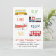 Um convite de festa de aniversário infantil com trem, caminhão de bombeiros, avião e um ônibus escolar.