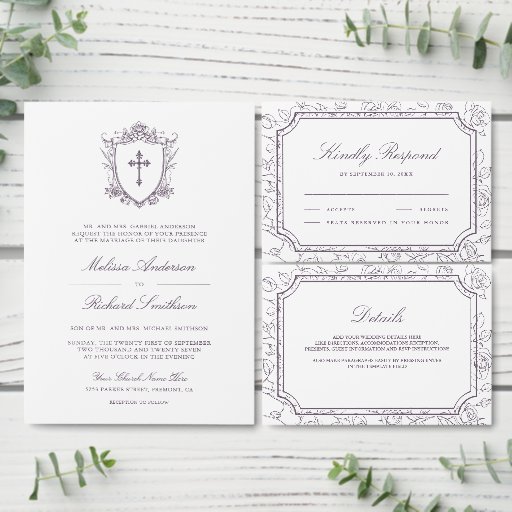 Amaze your guests with this elegant catholic wedding invite featuring beautiful victorian crest with intricate detail and QR code for online RSVP.