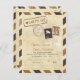 Convite inspirado em correio aéreo em tons vintage de castanho escuro e claro. Selos e marcações de correio falsos para um casamento com tema de viagem.