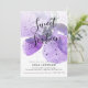 Um moderno e doce convite de aniversário, com uma flor violeta orquídea de cor violeta de tamanho excessivo como principal característica, sobreposto com a frase "16 doces" em sofisticadas letras negras manuscritas e detalhes de eventos em preto no terço inferior do convite. A parte de trás do convite está em violeta.
