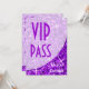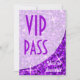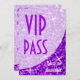 Convite com um design moderno com estrelas espalhadas por uma forma estilizada de "aparência de sequin" curvada em tons de roxo com 'VIP Pass you're convidado' escrito em roxo e branco. Pode ser usado como um fundo para seu próprio texto, imagens e ideias. O texto pode ser facilmente alterado usando o modelo fornecido ou clique no botão 'Personalizar' para fazer outras alterações. Observe que esta é uma imagem de arte digital impressa, ela não brilha ou contém falhas reais ou sequências.