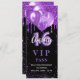 Um crachá moderno, na moda e glamouroso para uma festa de aniversário 21 (ou qualquer idade). Um fundo preto com brilho púrpura, pingos, pintura pingando e balões. Com o texto: VIP. Personalizar e adicionar nome, idade, endereço/data. Voltar: adicione detalhes da parte ou exclua. Traseira: sem design ou cor (menos caro)