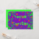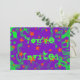 Convite com um fundo roxo e verde girando espalhado por estrelas laranja mágicas e brilhantes e a palavra 'Você é Convidado' escrita em verde brilhante. Um design personalizável roxo, verde e laranja para você adicionar seu próprio texto, imagens e ideias. O texto pode ser facilmente alterado usando o modelo fornecido ou clique no botão 'Personalizar o texto' para fazer outras alterações. Envelope correspondente e carimbo de correio disponível. Criado usando técnicas digitais por Jess Perry.