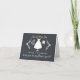 Cartão elegante de pedido de dama de flores com uma moldura branca sofisticada com vestido de noiva, sapatos de noiva, buquê de flores e véu sobre um fundo preto de lousa moderna.