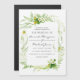 Convite magnético de casamento verde e branco que inclui samambaias, flores silvestres e morangos e um fundo de lavagem de cor verde-úmida.