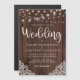 A madeira russa e as luzes de corda lançam um convite magnético de casamentos de rendas apresentando um fundo de madeira rústica com cordas de luz piscando e um lugar de estilo de vintagem nos cantos inferiores. A palavra casamento é lançada em uma elegante mas rústica tipografia, fazer este é o design perfeito para o seu casamento de vovô ou de campo.