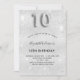 Um convite moderno, na moda e glamouroso para a 10ª festa de aniversário de uma menina. Um fundo com aparência de prata falsa, decorado com poeira brilhante. Personalize e adicione seu nome e detalhes da festa. O número 10 é escrito com uma fonte de estilo de balão, script.