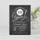 Convite rústico para festa de aniversário de 10 anos com padrão de quadro negro e fonte escrita em branco. Saúde por 10 anos! Perfeito para uma celebração elegante.
