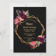 Na frente: Um convite para uma 100ª festa de aniversário. Um fundo preto chic com uma falsa estrutura geométrica dourada. Decorados com flores, rosas e penas do estilo "boho" escuras e burguesas. Modelos para um nome e detalhes da festa. O nome é escrito com um script de estilo manuscrito, letras ouros coloridas. Fundo preto e grandes rosas peludas em burgundy e Purple.