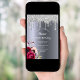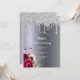 Na frente: Um convite para uma 100ª festa de aniversário. Um fundo metálico de aspecto prateado escuro. Decorado com púrpura escura e flores cor-de-rosa-burro e rosa, brilho fino prateado, aparência de pingar tinta. Modelos para um nome e detalhes da festa. O nome é escrito com um script de estilo manuscrito, letras coloridas de cinza clara. Traseira: fundo metálico prateado e gotejamento com brilho.