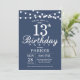 13 Aniversário com Luzes de Cordas. Fundo Azul. Aniversário de criança. Menina ou Menina Convidam. 13 15 16º 18º 20 21rua 30 40º 50º 60º 80 de 70 100º, qualquer idade. Para mais personalização, clique no botão "Personalizar" e use nossa ferramenta de design para modificar este modelo.