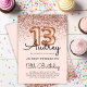 Convite de Aniversário para 13 de Balões Dourados com Rosa de Elegante Moderno Este convite de festas de Aniversário da Criança apresenta um elegante roteiro de caligrafia com letras de mão e balões de números de folhas de rosa de ouro divertidos em fundo rosa-claro. Ideal para a celebração de aniversário de uma menina de 13 anos, este convite capta perfeitamente a essência de um rosa moderno de ouro e festa de aniversário cintilante rosa-reluzente brilhante.