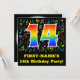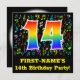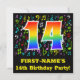 A frente desta design divertida, excitante e vibrante de convite de aniversário apresenta um grande número "14" tendo um padrão inspirado no gradiente do espectro arco-íris. Ele também apresenta um nome personalizável e a mensagem "14 Festa de aniversário!". Parte do fundo tem um padrão divertido de várias notas e símbolos de música com várias cores e tamanhos. A parte traseira contém detalhes/informações editáveis sobre o evento para o qual os possíveis convidados estão sendo convidados. Cartões de convite de aniversário felizes e editáveis como este podem ser usados ao convidar hóspedes para comparecer a uma reunião realizada para comemorar o aniversário de um cantor, um músico, um compositor de música ou outro 14. [~Z0000427]